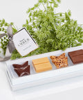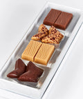 Amber Miniature-gaveæsken byder på en verden af velsmag i fire varianter. De små elegante stykker fyldte chokolader er alle omsluttet af vores forskellige Amber-varianter: Classic, Blond og Noir. Æsken byder på en verden af velsmag i form af blandt andet fleur d'orange praliné, vanilje, karamel, forfriskende mynte eller lakrids.